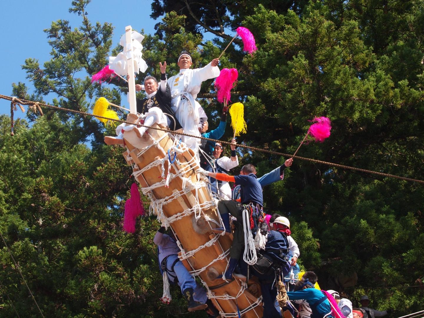 image: The Onbashira Matsuri is a festival where men climb on and slide down a mountain side on large timber logs, a holy tradition dating back 1,200 years. The lumber is then used to build the one of the main shrines of Japan, the Suwa Taisha.