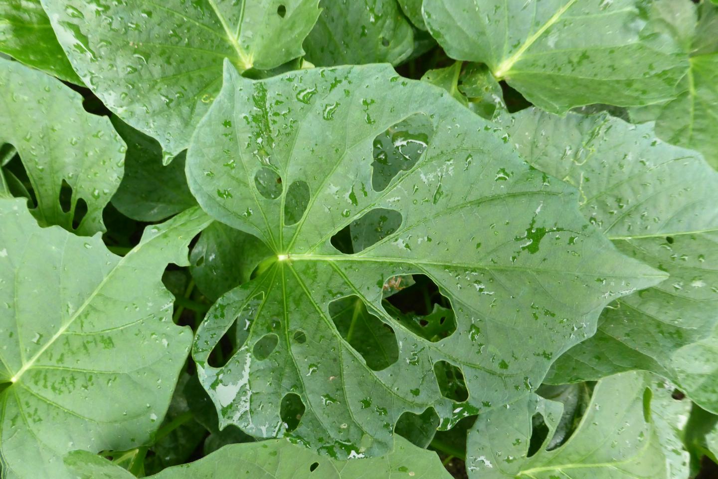 image: Typical herbivore damage on the leaves of sweet potato Ipomoea batatas: Researchers found that one single volatile from the plant's chemical vocabulary, namely (E)-3,8-dimethyl-1,4,7-nonatriene or DMNT, can alert neighboring plants to activate their defenses against insect attack.