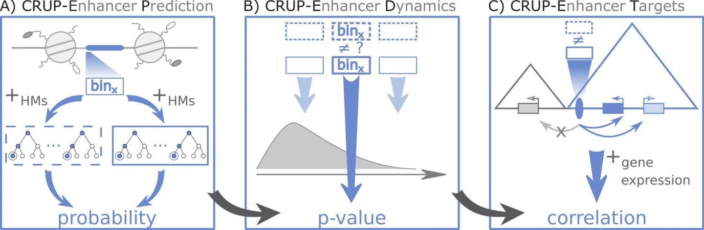 CRUP specifically identifies and characterizes enhancers - DNA segments that stimulate or "enhance" the transcription of genes. These regions attract proteins that attach to promoter sequences which function as a switch for each gene. However, which enhancer controls the right genes at correct time often remains a mystery. "Enhancers and their associated genes can be located far away from each other," says Heinrich. "This makes it difficult for us to assign the regulatory sequences to their respective targets."