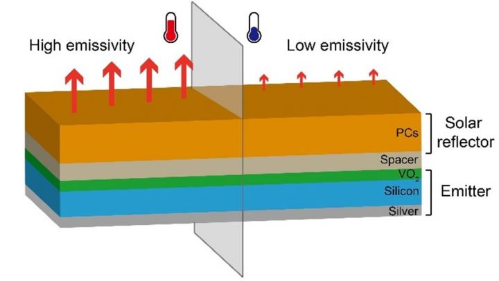 The authors of this article propose a switchable radiative cooler that satisfies the aforementioned conditions using VO2. They have designed a switchable emitter by stacking VO2 on an insulator-metal layer. The resultant tri-layer structure emits its heat to the atmosphere above the transition temperature. This emitter is combined with a solar reflector, that is composed of several one-dimensional photonic crystals, to form a switchable radiative cooler. Thus, the overall system can block heat from solar energy while emitting thermal energy to the atmosphere.