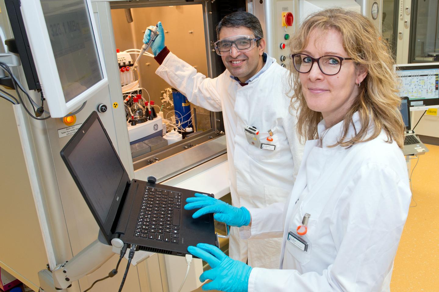 After conducting the first promising preclinical studies of their new compound [18F]FACH, the scientists revised their synthetic pathway. "The challenge is to produce the radiotracer fast enough so we can harness the radiating properties of 18F in practical applications," radiochemist Dr. Barbara Wenzel explains. The timespan during which the radiotracer is usable is determined by the half-life of the radionuclide. While the chemists initially needed 160 minutes to manually produce the new radiotracer, they were now able to reduce the synthesis time by half by modifying their approach..