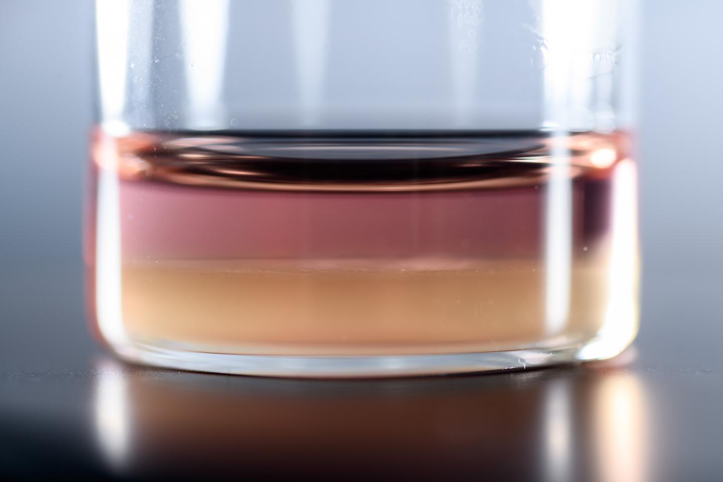 image: In a vile, three watery solutions phase separate into three layers. In membraneless organelles, chemical reactions occur at the interfaces of such layers, processing a reactant step-by-step and moving the reaction product from one layer to the next.