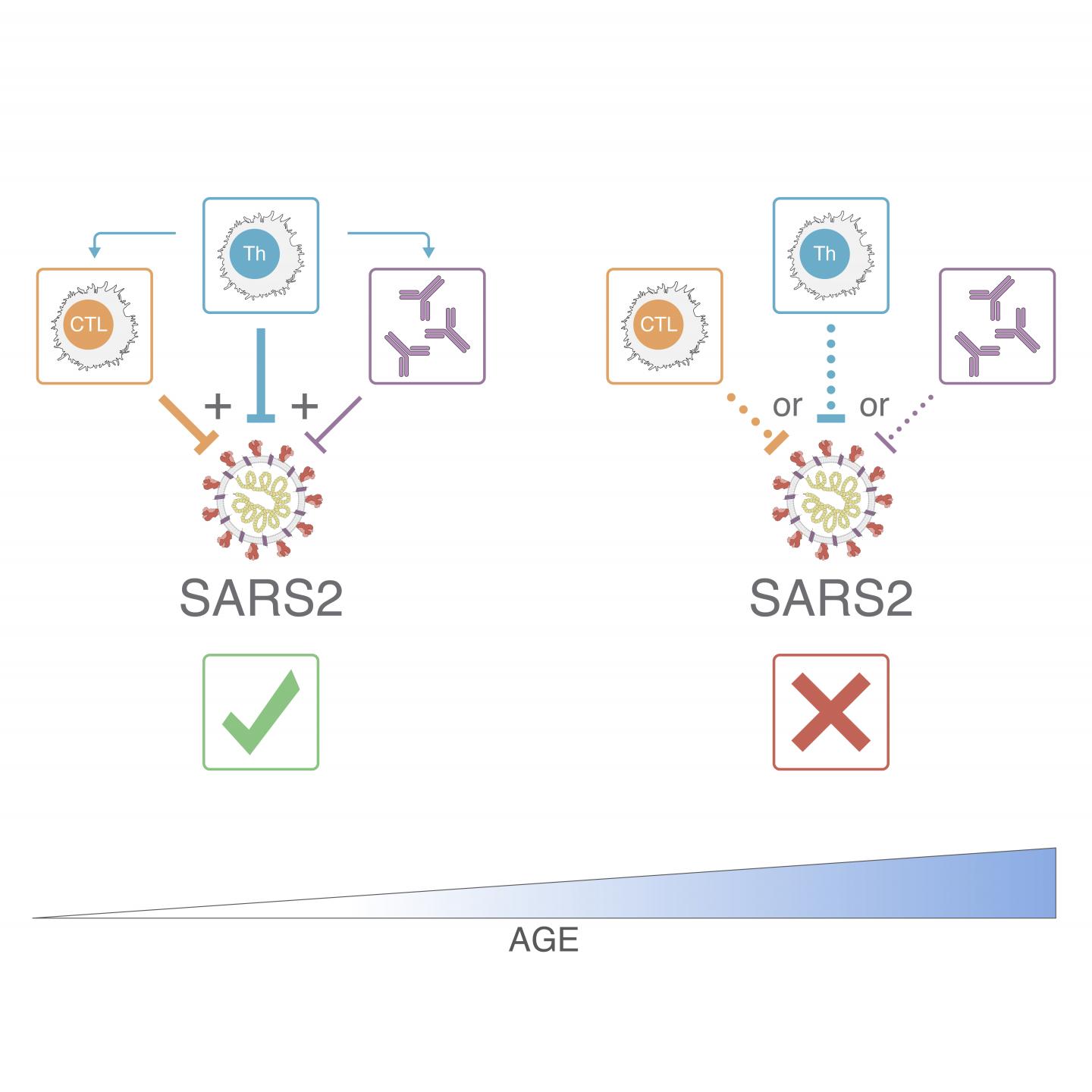 The effect was magnified when the researchers broke down the dataset by age. "People over the age of 65 were much more likely to have poor T cell responses, and a poorly coordinated immune response, and thus have much more severe or fatal COVID-19," says Crotty. "Thus, part of the massive susceptibility of the elderly to COVID-19 appears to be a weak adaptive immune response, which may be because of fewer naïve T cells in the elderly."