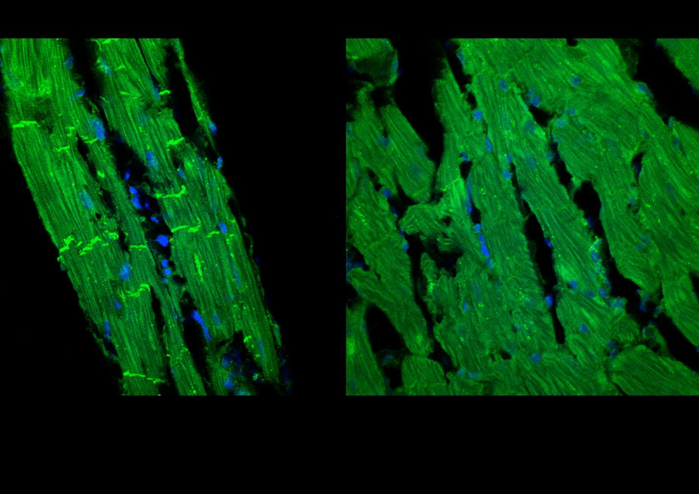 image: Left ventricular tissue sections (7-μm thick) from aged rat hearts (24 months old) were labeled with the nuclear stain (DAPI-blue) and an antibody against β-catenin (green). Rats were treated with Relaxin (0.4 mg/kg/day for 2-weeks) (left panel) or with the control vehicle (sodium acetate) (right panel) and the tissue sections were imaged by confocal microscopy (600X magnification). Relaxin treatment (left) produced a marked positive remodeling of aged ventricles with a reduction of cell hypertrophy, improved organization of myofibrils and cell membrane compared to untreated, control aged hearts (right).