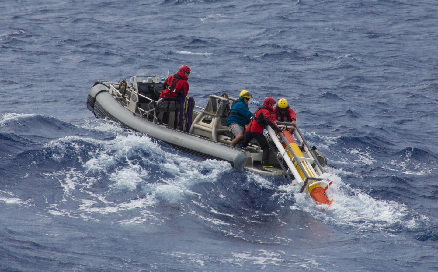 image: Scientists and engineers from MBARI and the University of Hawai'i deployed a trio of autonomous vehicles from the Schmidt Ocean Institute's R/V Falkor to investigate phytoplankton communities in an ocean eddy north of the Hawaiian Islands. The team is deploying an AUV on leg one of the mission.