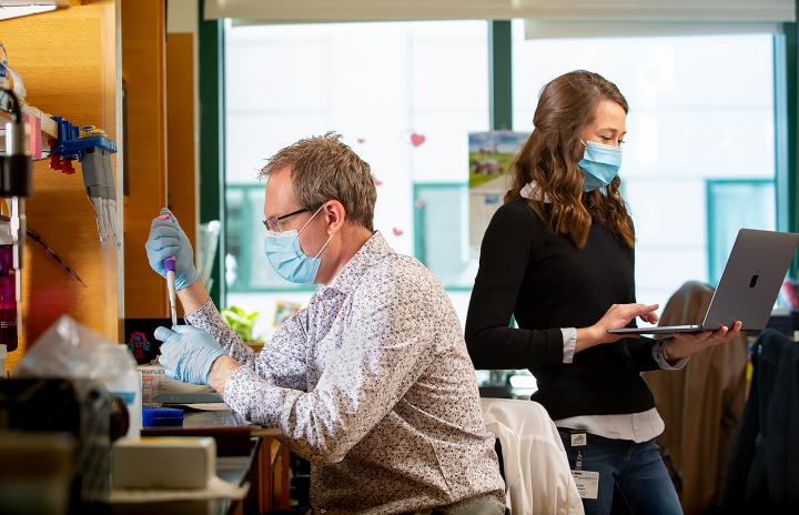 image: Todd Miller, PhD (left), and Nicole Traphagen, a PhD candidate in the Miller Laboratory, have found a method for long-term control of drug-resistant breast cancer growth in preclinical models by switching between estrogen and anti-estrogen therapies. The strategy is now in human clinical trials at Dartmouth's and Dartmouth-Hitchcock's Norris Cotton Cancer Center.
