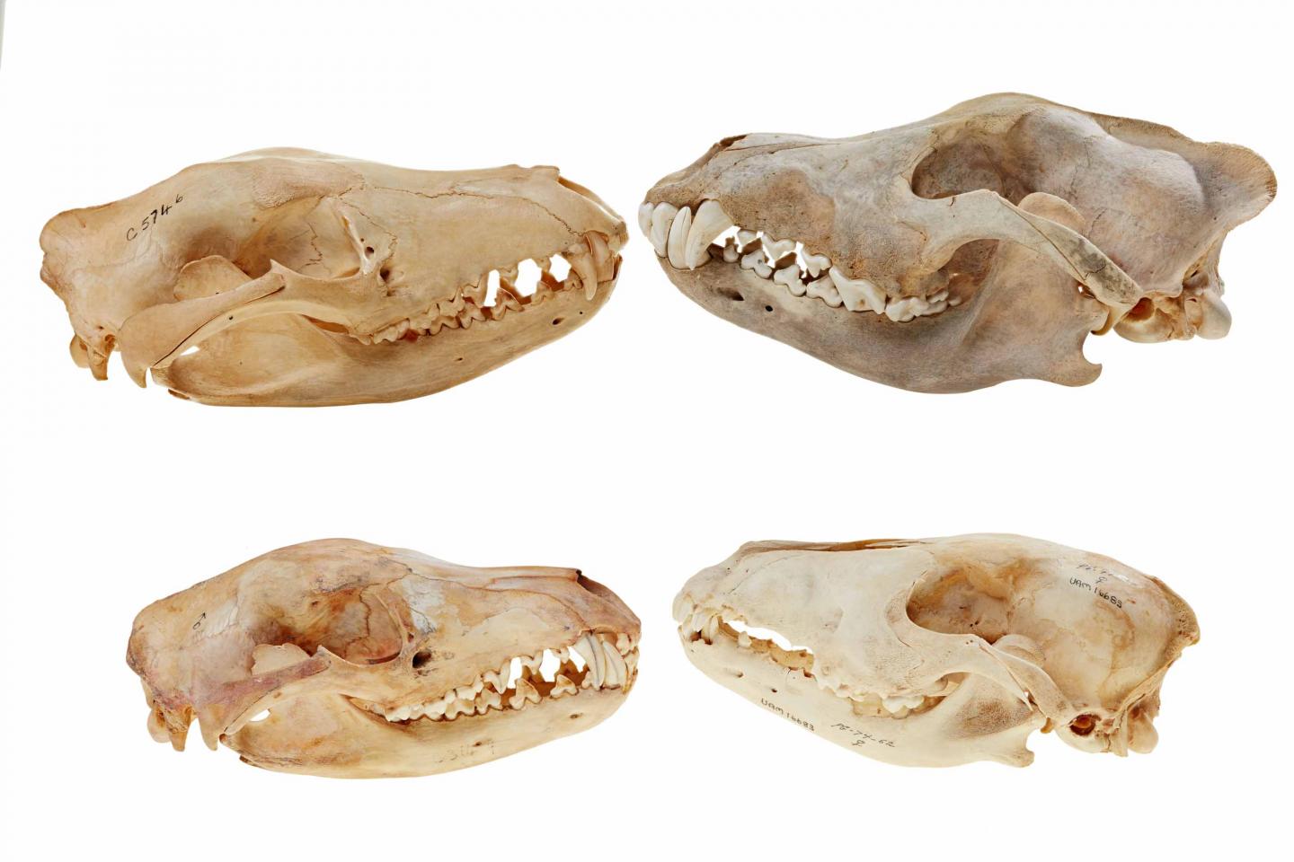 image: Skulls from top to bottom: Adult wolf, adult thylacine, juvenile thylacine, young thylacine.