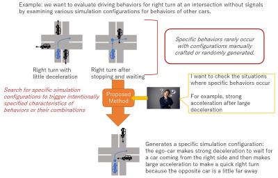 image: The research team at National Institute of Informatics developed a technique to search automatically for simulation configurations that test various behaviors of automated driving systems. This research was conducted under ERATO-MMSD project. The proposed technique iterates trials on simulations using an optimization method called evolutionary computation so that it discovers simulation configurations that lead to specific features of driving behaviors such as high acceleration, deceleration, and steering operation. This research was presented in ICST 2021.