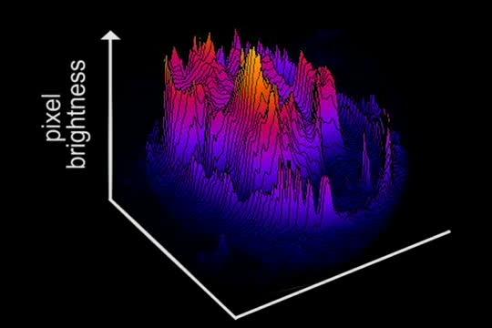 video: A 3D surface plot of fluctuating pixel brightness in the video of an embryo with the highest peaks, which are orange, indicating the brightest pixels