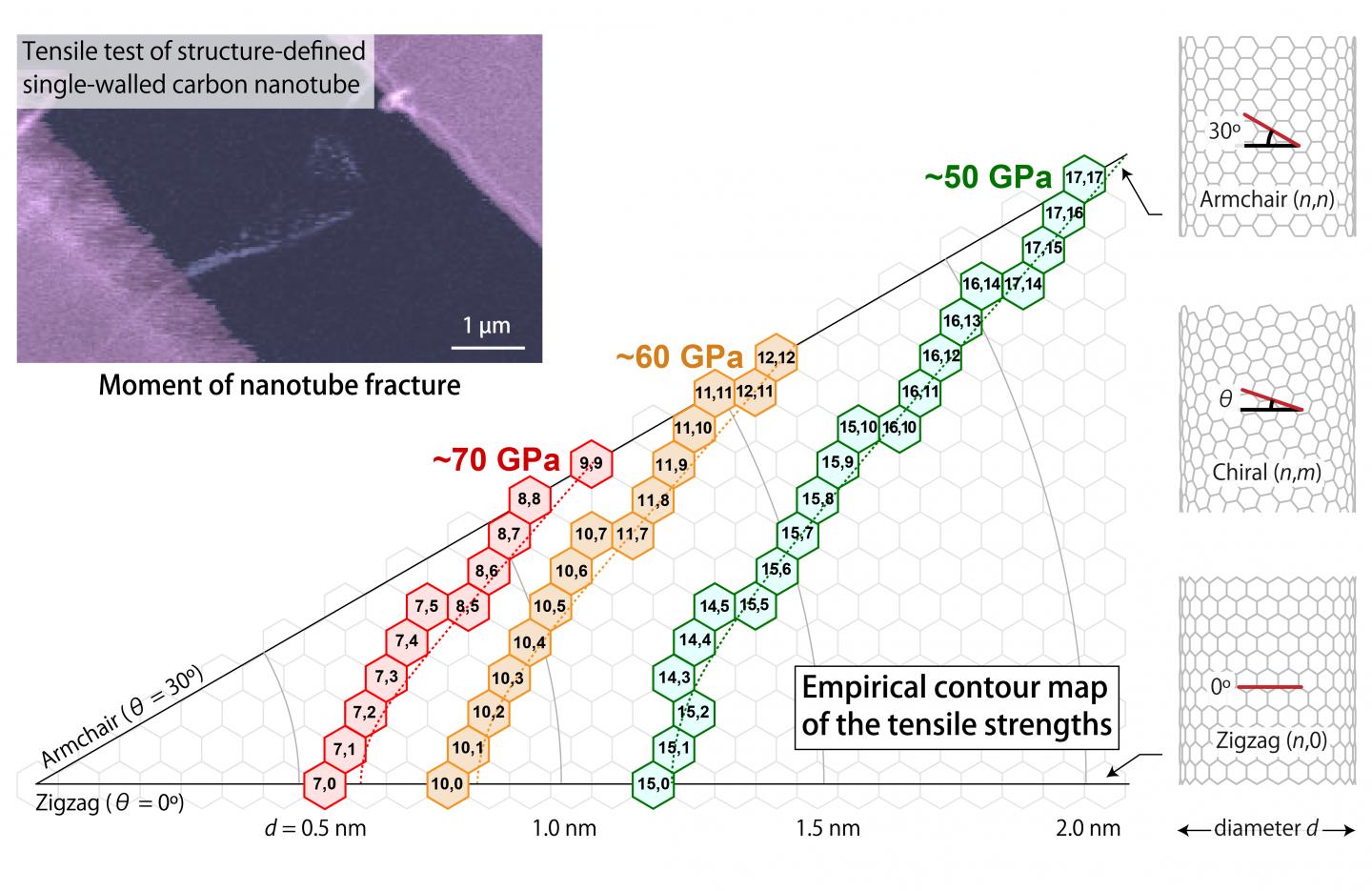 The team succeeded in measuring the tensile strengths of 16 structure-defined nanotube species. Figure 3a summarizes the structure dependence of the measured ultimate tensile nanotube strengths. The strengths are seemingly dependent on both the chiral angle (Fig. 3b) and diameter (Fig. 3c) of the nanotubes.
