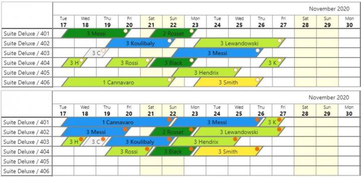 image: Traditional allocation of rooms (above), optimal allocation (below). This example shows that two rooms become available. The image has been developed by the research group of the University of Trento