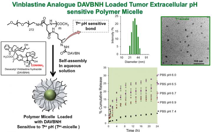 Hydrazone bonding was chosen as a linker that causes acidic cleavage and prepared by selecting a block polymer with carbonyl group such as ketones or aldehydes and using desacetyl vinblastine hydrazide (DAVBNH) as a vinca alkaloid. It is known that DAVBNH is 6 times more potent than vinblastine in suppressing the growth of glioblastoma. Self-association of a PEG-PAA block copolymer with DAVBNH attached to an aliphatic ketone residue in water was able to produce nanomicelles with an average diameter of 31 nm, containing DAVBNH in its inner core. Examining the stability of these micelles in solutions at various acidities from pH 6.0 to pH 7.4, the amount of free DAVBNH was significantly different between pH 6.9 and pH 7.4. In other words, it was found that the drug can be released on the slightly acidic side by accurately capturing the subtle difference in pH. It was also found that when the ketone residue is changed to an aldehyde residue, the drug is not released until the pH drops below 5.0.