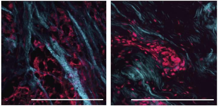 image: Compared with an untreated breast tumor (left), the extracellular collagen matrix (blue) is reorganized in a residual tumor after therapy (right), activating a signaling pathway in tumor cells (magenta) that allows them to survive and initiate tumor recurrence.