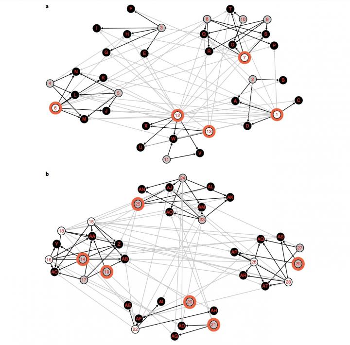 image: a, This is a sociogram for an operating unit in the treatment group. b, This is a sociogram for an operating unit in the control group. IBSs are represented by white nodes, non-boundary spanners are represented by grey nodes, and projects are represented by black nodes. Nodes with orange circles are people targeted by the experiment. Black lines represent ties from people to projects in the same cluster, and grey lines represent ties from people to projects in different clusters.