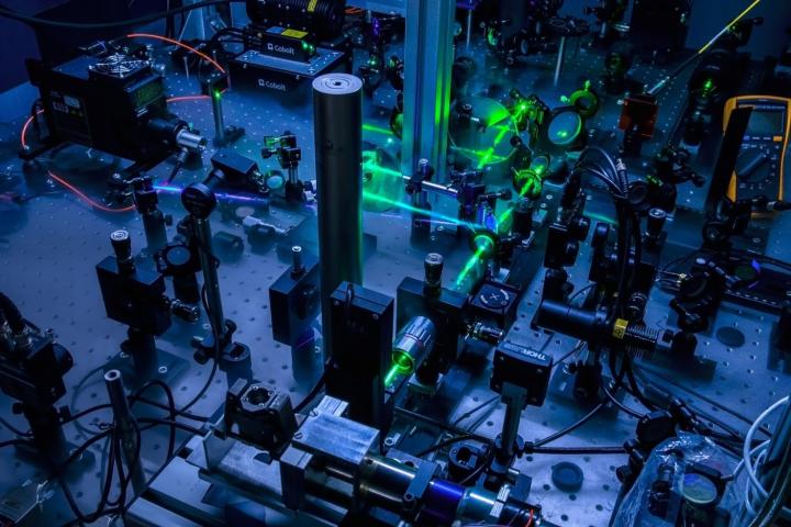 image: Amplified frequency-domain thermoreflectance setup used to study the existence of second sound in germanium. Two different lasers are focused onto the surface of the samples using a microscope objective. A rather large combination of optical elements allows to control and modify the spot size and shape, as well as the power and harmonic modulation of the lasers. Cold nitrogen gas is used for better visualization of the lasers optical path.
