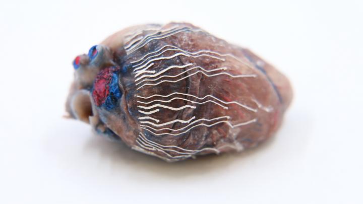 image: The new biosensors allow for simultaneous recording and imaging of tissues and organs during surgical procedures. In this photo, researchers attached the biosensor to the heart of a pig that was obtained commercially.