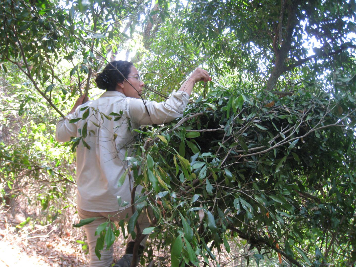 image: This is Adriana Hernandez-Aguilar swabbing leaf in chimpanzee nest for microbes. The work was part of a study that evaluated the microbes and arthropods found in the treetop beds that chimpanzees make each night.