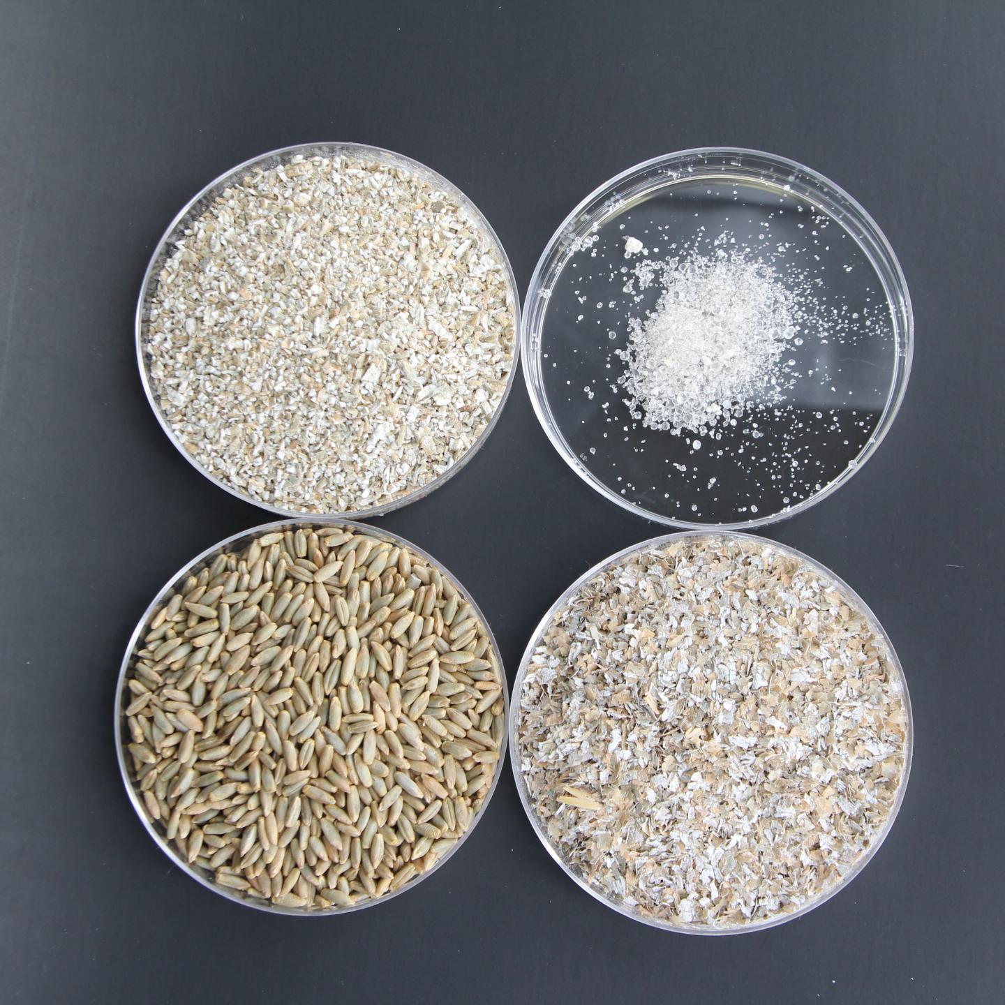 image: The various stages of processing rye, from berries to alkylresorcinols (top left to bottom right): rye berries, rye chops (coarsely ground rye berries), rye bran, and alkylresorcinols (extracted and purified from rye bran).