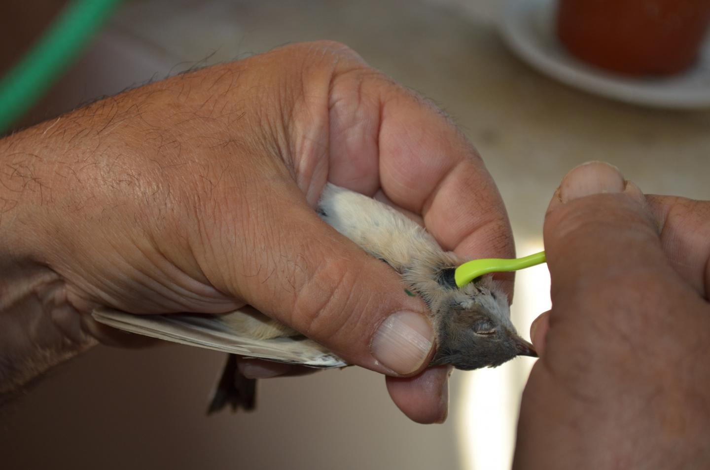 image: Removal of tick from Common whitethroat (Sylvia communis) caught in mist net at Capri, Italy, by ornithologist Dario Piacentini.