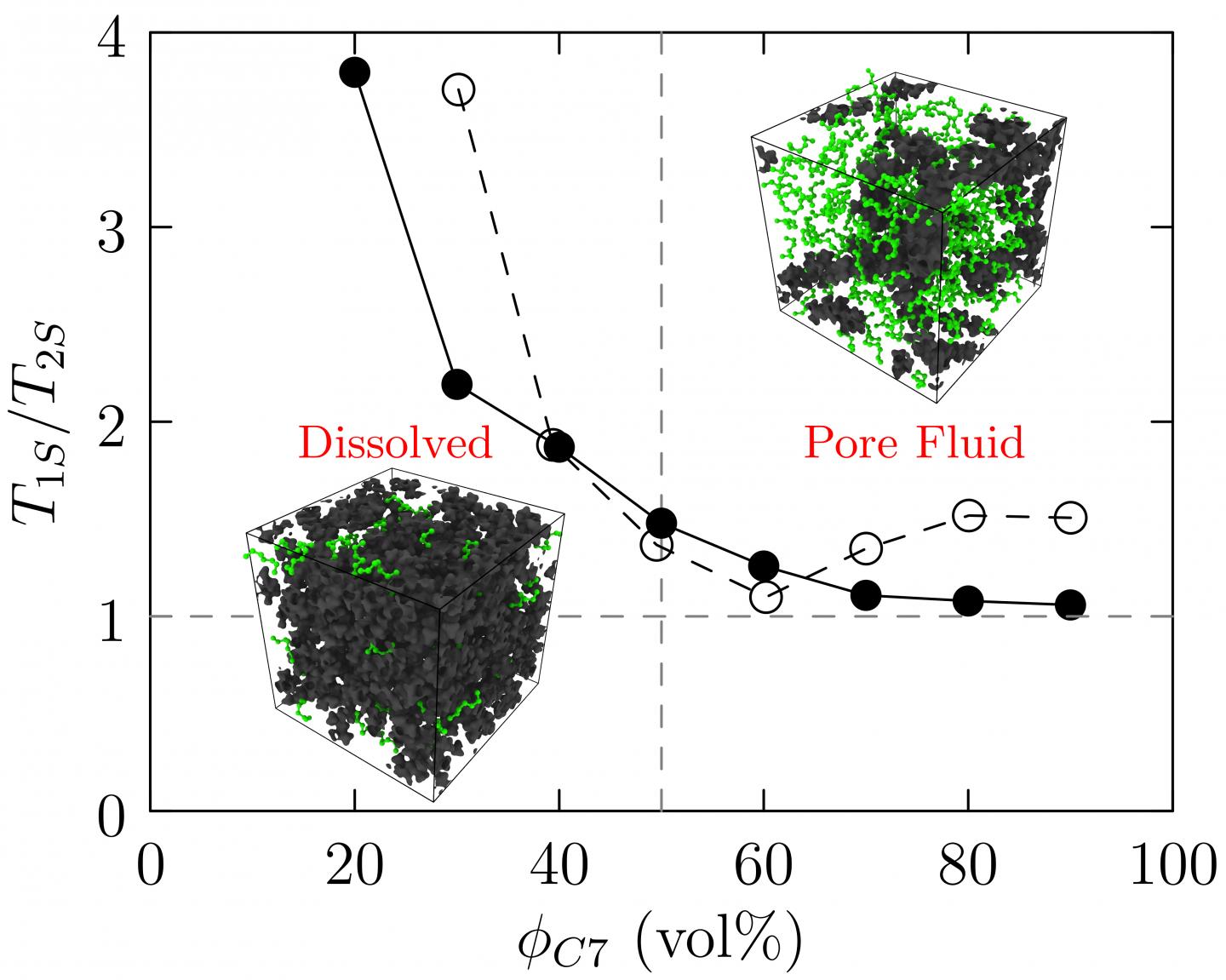 image: Rice University researchers used large-scale simulations to eliminate the role of paramagnetism in NMR characterization of oil and shale deposits in nanoporous shale formations. Under strong confinement, they found the volume fraction of heptane in a model polymer is low, as though the light hydrocarbon is being dissolved in the confining matrix. The figure shows measurements (open circles) and simulation results (filled circles) of the T1/T2 ratio for surface relaxation for one applied magnetic-field strength.