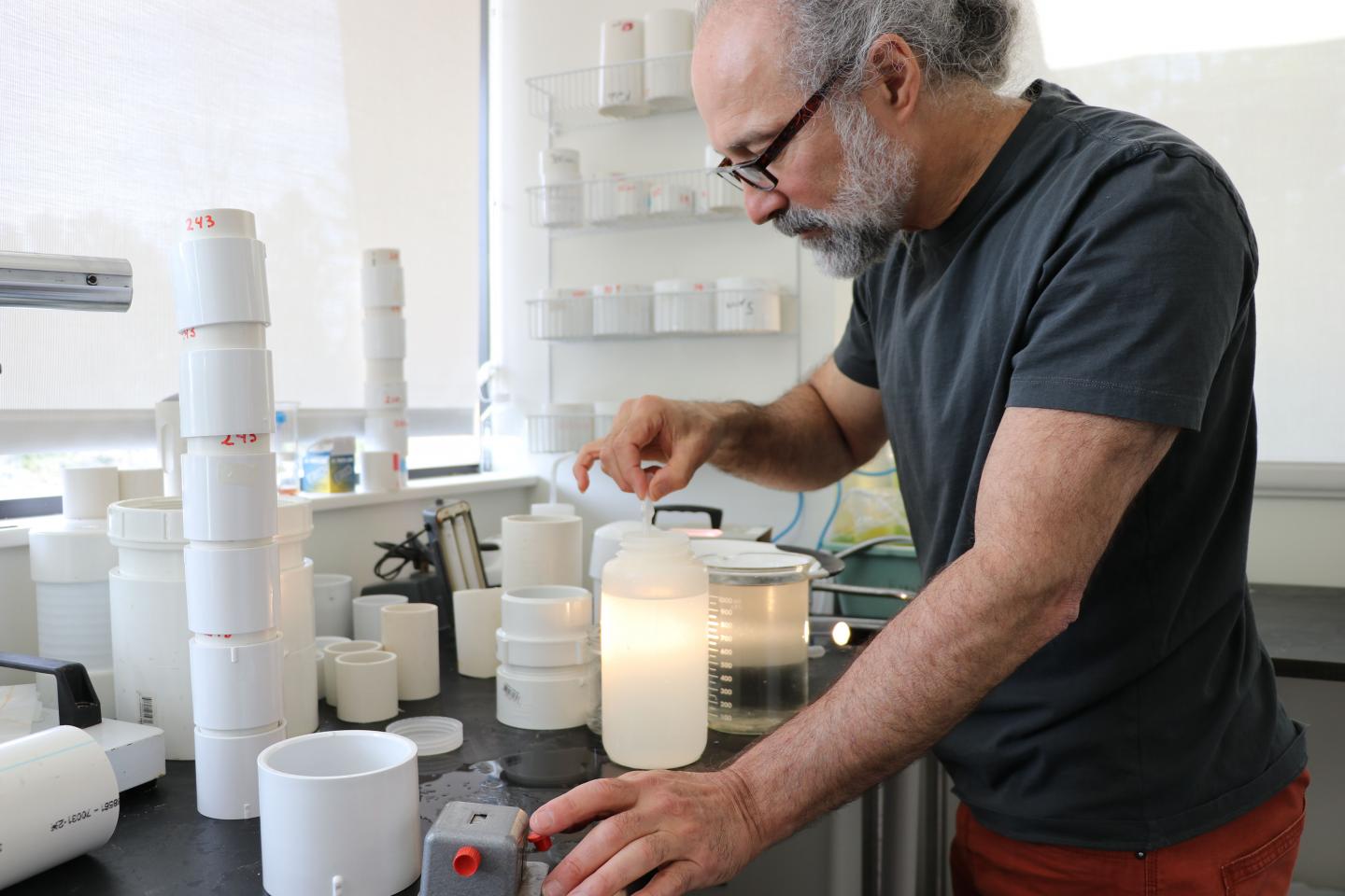 image: Bigelow Laboratory researcher David Fields prepares copepod samples in the lab. Fields was a co-author on a recently published study that found copepods gather around small vortexes in the ocean, which could have significant implications for the food web.