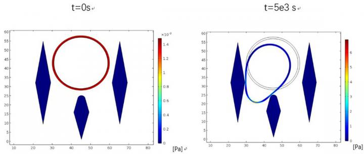 image: Simulations showing cancerous multiple myeloma cells, also known as cCPCs, getting stuck between micropillars in a new filter device, described in Biomicrofluidics. Blue outline is the cCPC and fluid is flowing is from top to bottom.