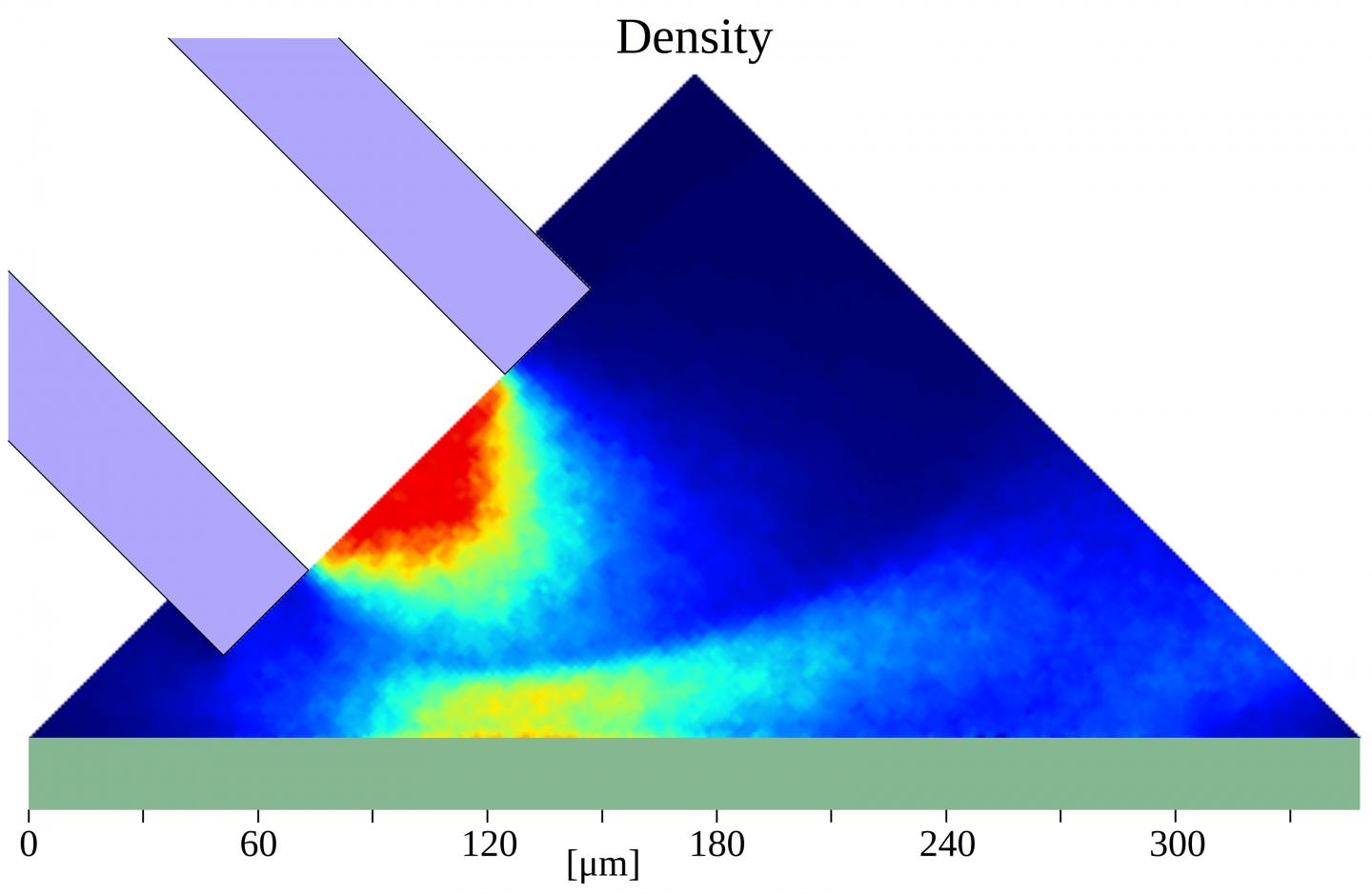 image: Cross-section view shows molecular density of the supersonic gas jet as it expands in vacuum and impinges onto a substrate, leading to accelerated material deposition from an energized adsorbed precursor.