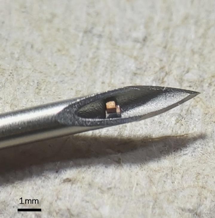 image: Chips shown in the tip of a hypodermic needle. Columbia Engineers develop the smallest single-chip system that is a complete functioning electronic circuit; implantable chips visible only in a microscope point the way to developing chips that can be injected into the body with a hypodermic needle to monitor medical conditions.
