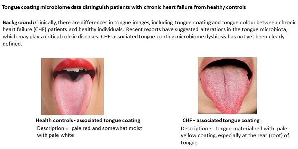 image: Clinically, there are differences in tongue images, including tongue coating and tongue colour between chronic heart failure (CHF) patients and healthy individuals. Recent reports have suggested alterations in the tongue microbiota, which may play a critical role in diseases. CHF-associated tongue coating microbiome dysbiosis has not yet been clearly defined.