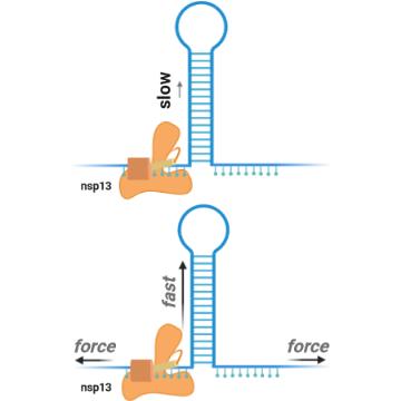 image: Nsp13 helicase (orange) unwinds RNA (blue), the same material as the SARS-CoV-2 genome. Recent findings show that mechanical forces (black arrows) increase nsp13 unwinding efficiency.