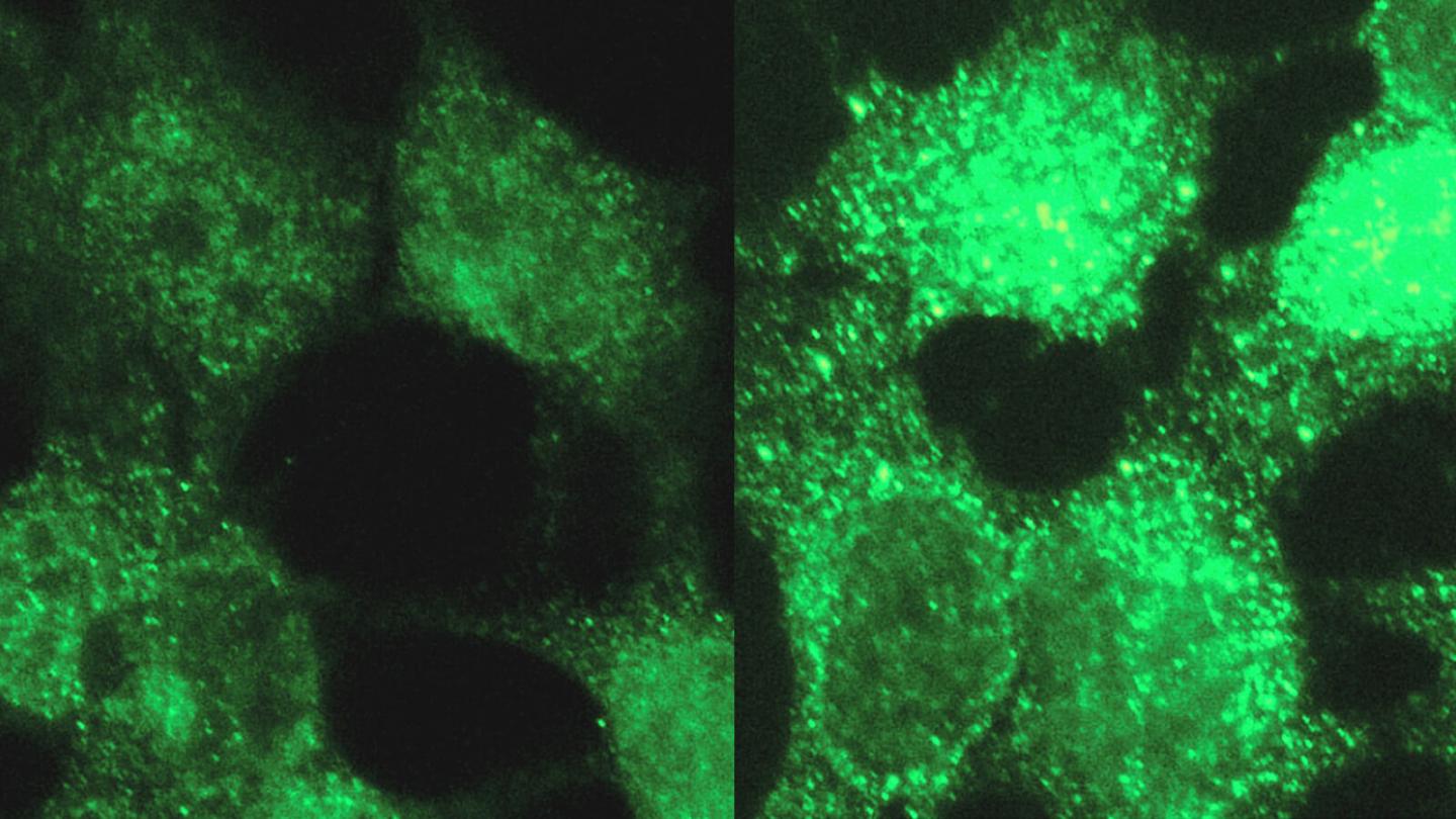 image: In a demonstration of a tool for revealing molecular differences between diseases, researchers discovered four genes associated with a rare pediatric cancer. The image on the left shows a normal cell while the one on the right highlights one of the discovered genes in neuroblastoma, which afflicts babies and young children.