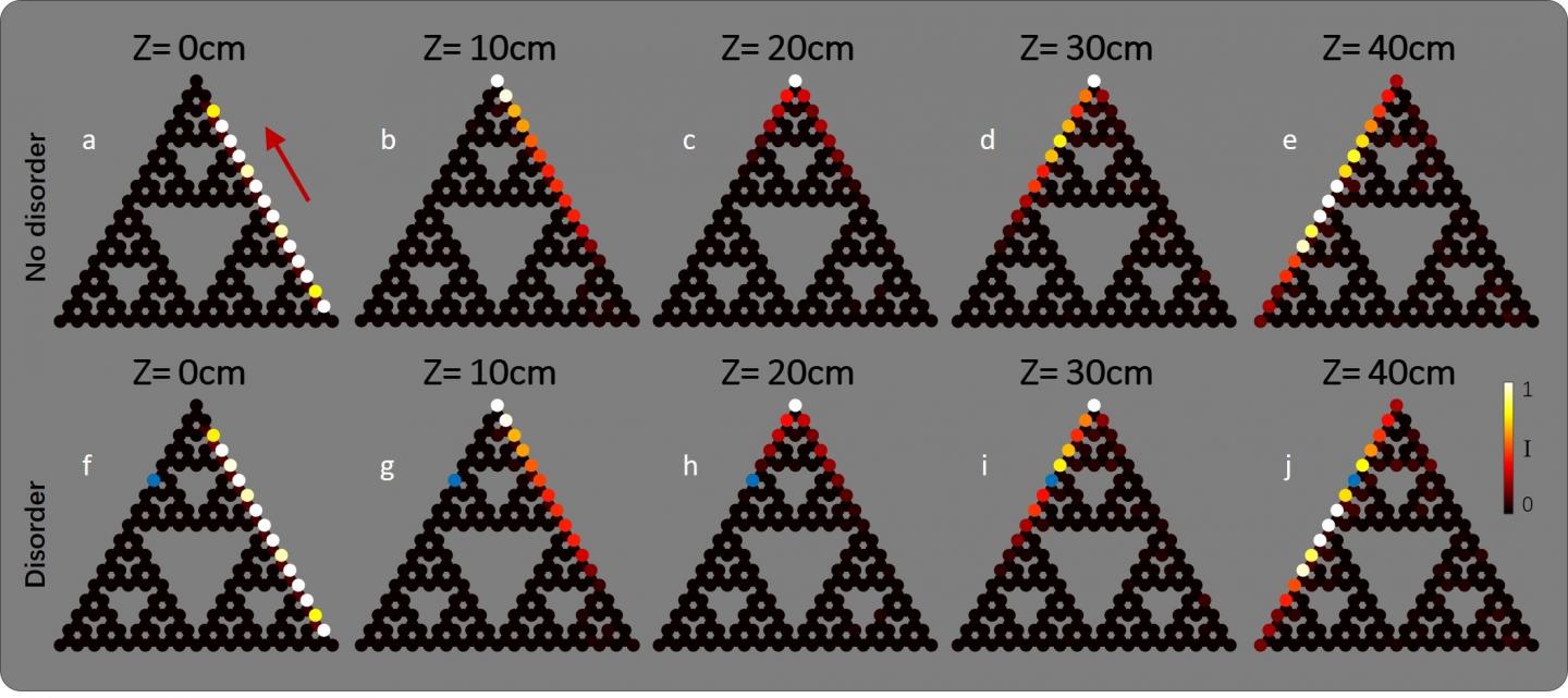 image: a-e Evolution of topological edge states in the fractal SG(4) lattice. a Intensity distribution of the initial field constructed from a truncated topological edge state in the fractal lattice. b-e Intensity distribution at propagation distances . f-j Evolution in the fractal lattice containing on-site disorder of , whose position is marked by the blue dot. The wavepacket displays topologically-protected edge transport around the corners and is unaffected by the disorder. The color bar indicates the field intensity.