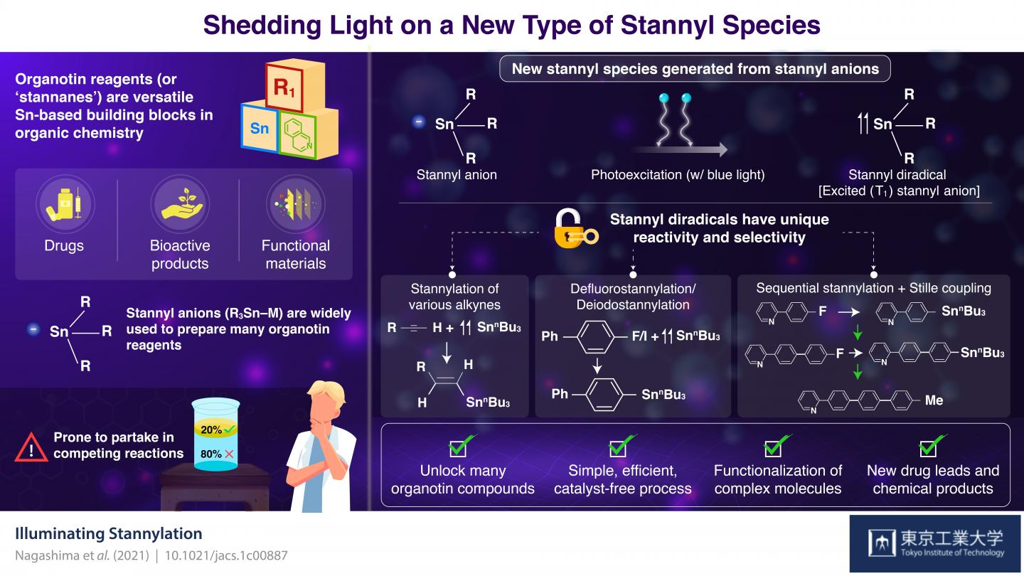 Surprisingly, in a recent collaborative study by Tokyo Institute of Technology and The University of Tokyo, Japan, scientists discovered a new type of stannyl species useful for producing organotin reagents. In their paper, published in the Journal of the American Chemical Society, they explain that this new stannyl species was first theorized to exist based on small anomalies observed in previous works. "During our studies involving stannyl anions, we occasionally detected small amounts of compounds called distannanes that were probably generated by the irradiation of stannyl anions with light. Inspired by these observations, we became interested in exploring the synthesis applications of these theoretical photoexcited stannyl anion species," explains Assistant Professor Yuki Nagashima, lead researcher from Tokyo Tech.