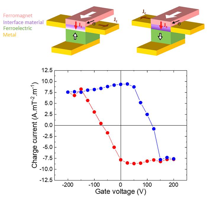 image: (Top) Example of the system developed: a ferromagnetic material that can generate a spin current and inject it into an interface material, in which it is converted into a charge current. Traditionally, in order to change the sign of the charge current produced, the magnetization of the ferromagnetic material must be reversed by applying a magnetic field or a powerful current. Here this is produced by reversing the polarisation of the ferroelectric material using an electric field. (Bottom) Experimental curve showing the evolution of the charge produced as a function of the voltage applied to the ferroelectric material.