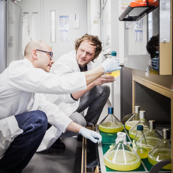 image: Felix Klatt and Dr. Claus-D. Kuhn (r.) while working with High Five insect cells.