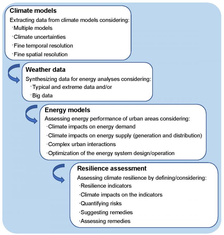 image: A general framework for assessing the climate resilience of urban energy systems, illustrating different components that should be considered. Assessing the climate resilience of energy systems in the urban context requires considering a wide range of future climate projections and accounting for different components/levels (e.g. building, urban, generation, demand and supply, centralized and decentralized energy systems) and their complex interactions.