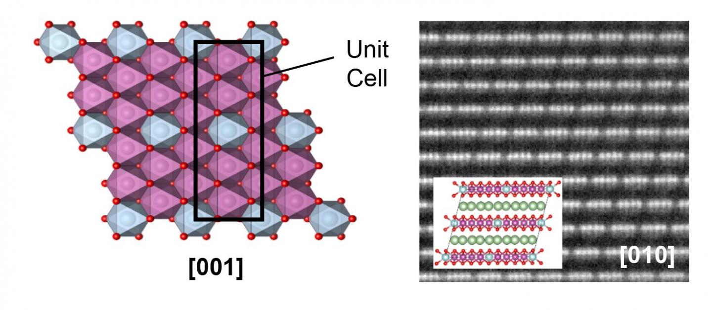 image: Images from a high-resolution scanning electron microscope, and atomic models in which can be observed the atomic structure of the cathodes that suffer energy-density loss in the first charge cycle (left) and the new superstructure that prevents this loss (right).