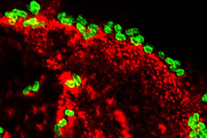 image: Toxin-producing E. coli bacteria (green) attach to human intestinal cells expressing the protein CEACAM6 (red). A study from researchers at Washington University School of Medicine in St. Louis has found that a toxin produced by E. coli changes intestinal cells to benefit itself, an ability that could provide a clue to why the bacteria have been linked to nutritional problems such as malnutrition and stunted growth.