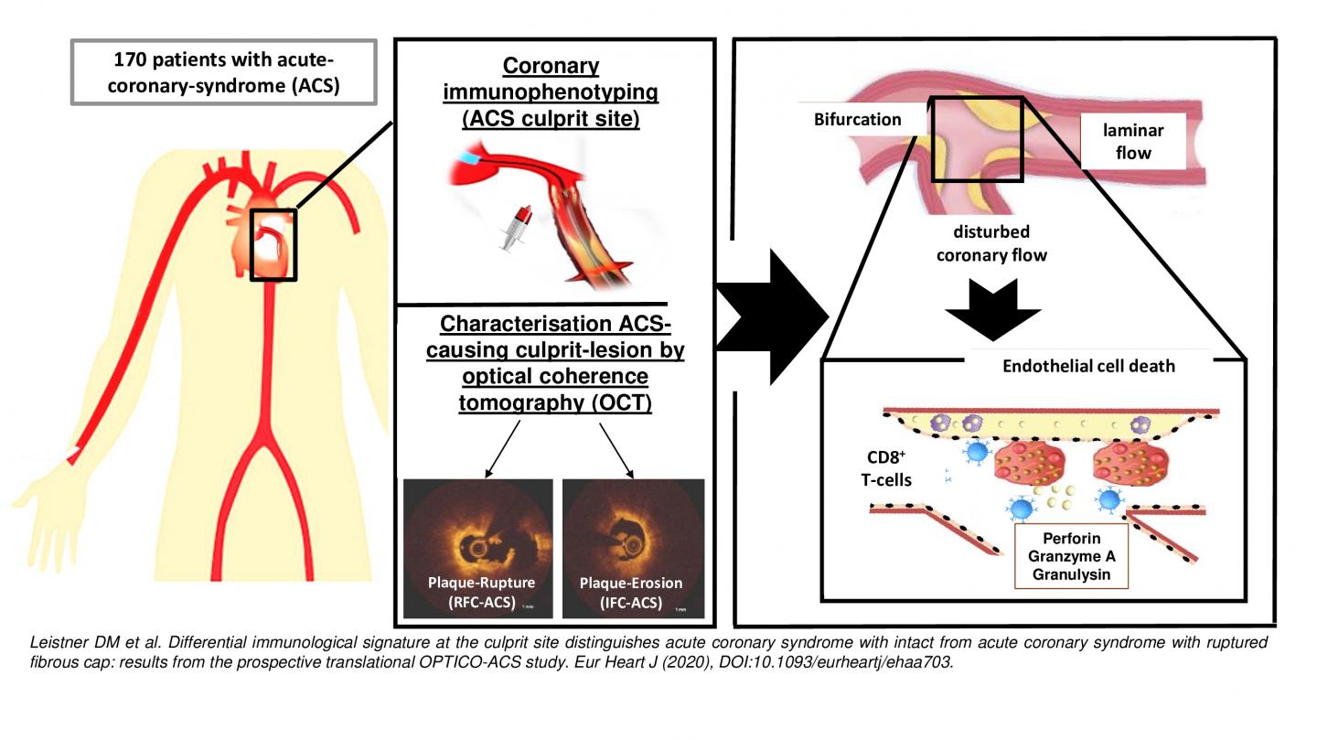Using special high-resolution imaging technology known as optical coherence tomography (OCT), the researchers were able to visualize the heart attack-causing plaques for classification into the 'plaque rupture' and 'plaque erosion' trigger categories. Using an aspiration catheter, the researchers then removed the blood clots for analysis. They also collected blood samples, which were tested for immune cells and markers of inflammation. Blood clot analysis revealed altered immune cell ratios in approximately one quarter of blood clots, namely those which had originated from sites of plaque erosion. These showed increased levels of CD4+ and CD8+ lymphocytes and their effector molecules, a finding which suggests an inflammatory response that causes damage to endothelial cells in the arterial wall. In these patients, the culprit blood clots were also found near sites of arterial branching, an environment which is known to create altered blood flow patterns. Prof. Leistner adds: "In the hope of reinforcing our patient-based observations - and in keeping with our translational approach - we also used cell culture experiments, which enabled us to confirm our findings."