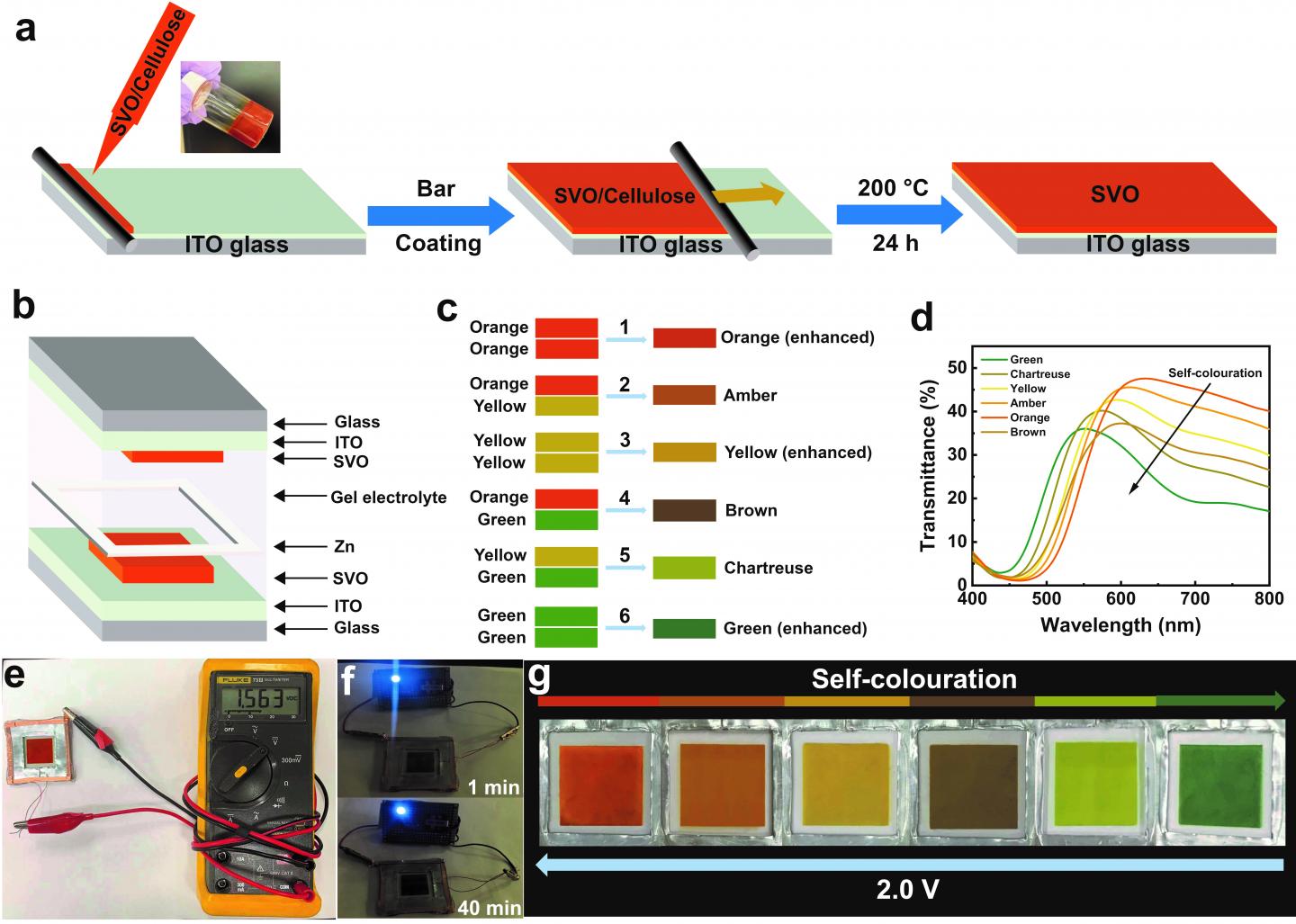 image: a, Schematic diagram of the bar-coating process. The inset shows a digital photograph of the SVO/cellulose paste. b, Schematic illustration of a Zn-SVO electrochromic display platform. c, Schematic illustration of the colour overlay effect via the combination of orange, yellow, and green colours. The upper colour code represents the colour of the top SVO electrode, while the lower colour code represents the colour of the bottom SVO electrode. d, Visible-near infrared transmittance spectra of the display under different colour states. e, Digital photograph of the display having an orange colour, showing an OCP of 1.56 V. f, Digital photographs of a 0.5 V regulated LED powered by the Zn-SVO electrochromic display at 1 min and 40 mins. g, Digital photographs of the Zn-SVO display showing six colours obtained through the colour overlay effect.