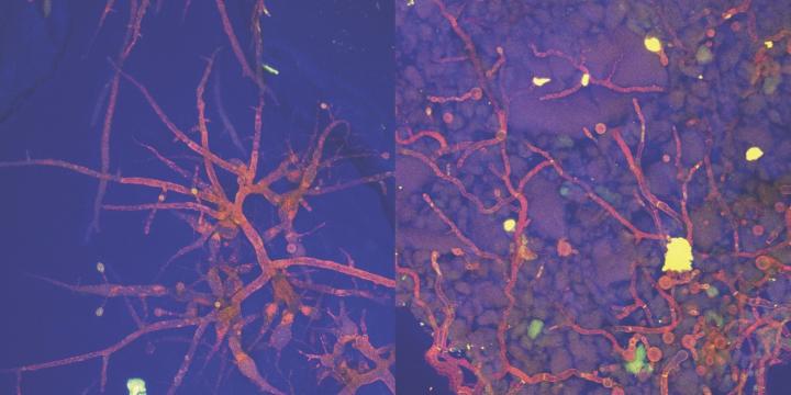 image: Fungal filaments (false-coloured pink) grown in liquid (left) or transparent soil (right)