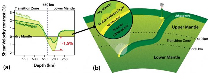 image: (a) Shear velocity contrast between the Al-rich hydrous layer (including Al-phase D) and the dry mantle for two model compositions: hydrous pyrolite (h-pyrolite) and hydrous harzburgite (h-Harzburgite). (b) Hypothetical mechanisms of water transportation in the subduction zone from the shallower lithosphere to the uppermost lower mantle by hydrogen transfer between hydrous phases and melts (modified from Pamato et al., 2014).
