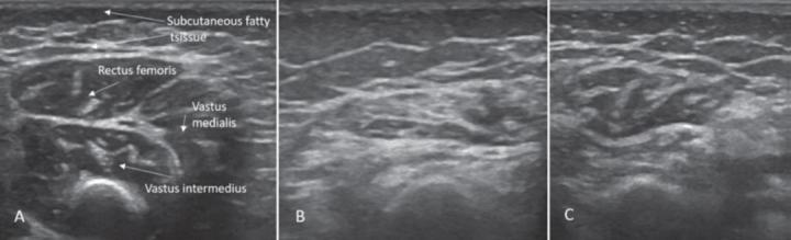 image: Sonographic findings of quadriceps in child diagnosed with SMA: (A) Age 2 months: normal echogenicity and clearly visible internal septa. (B) Age 14 months, 6 months after onset of disease: a pathologic increase in background echogenicity in comparison to subcutaneous fat tissue and less definable intramuscular septa. (C) Age 17 months, after eight months of nusinersen therapy: partial recovery with increase in volume and normalization of echogenicity in the rectus femoris.