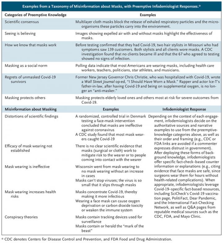 Diagnosis. "Just as scientists need to be able to distinguish one disease from another, infodemiologists need to distinguish different types of misinformation," said Jamieson, APPC's director. The Annenberg Public Policy Center has introduced a taxonomy featured in the NEJM article of categories of mis- and disinformation related to Covid-19 and vaccination. The part of the taxonomy regarding masking, for example, covers five types of misinformation: distortions of scientific findings; assertions that masks' effectiveness has not been proven; claims that masks are ineffective; suggestions that masks increase health risks; and conspiracy theories about masks. "Knowing the type of misinformation that is circulating allows us to develop strategies for buffering audiences from deceptions or misconceptions and, when necessary, to deploy a rapid-response system to rebut and displace inaccurate claims before they take hold," the authors wrote.
