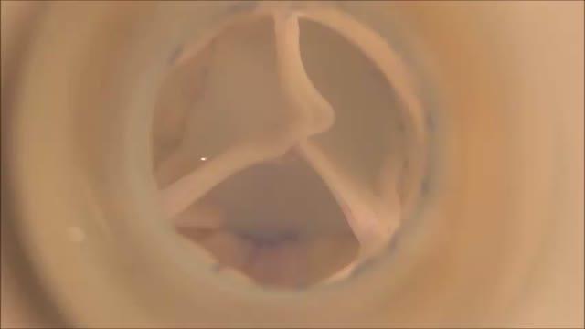 video: End view of the tri-tube valved conduit during hydrodynamic testing. This material relates to a paper that appeared in the Mar. 17, 2021, issue of Science Translational Medicine, published by AAAS. The paper, by Z.H. Syedain at University of Minnesota in Minneapolis, MN; and colleagues was titled, "Pediatric tri-tube valved conduits made from fibroblast-produced extracellular matrix evaluated over 52 weeks in growing lambs."