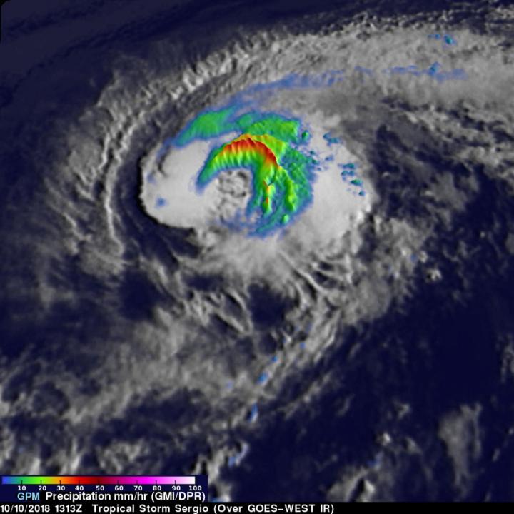 image: GPM measured rainfall within tropical storm Sergio on October 10, 2018 at 9:13 a.m. EDT (1313 UTC). Measurements indicated that the heaviest rainfall was north of Sergio's eye like feature. Rain was shown to be falling at a rate of over 2.2 inches (55.9 mm) per hour in that part of the tropical storm.
