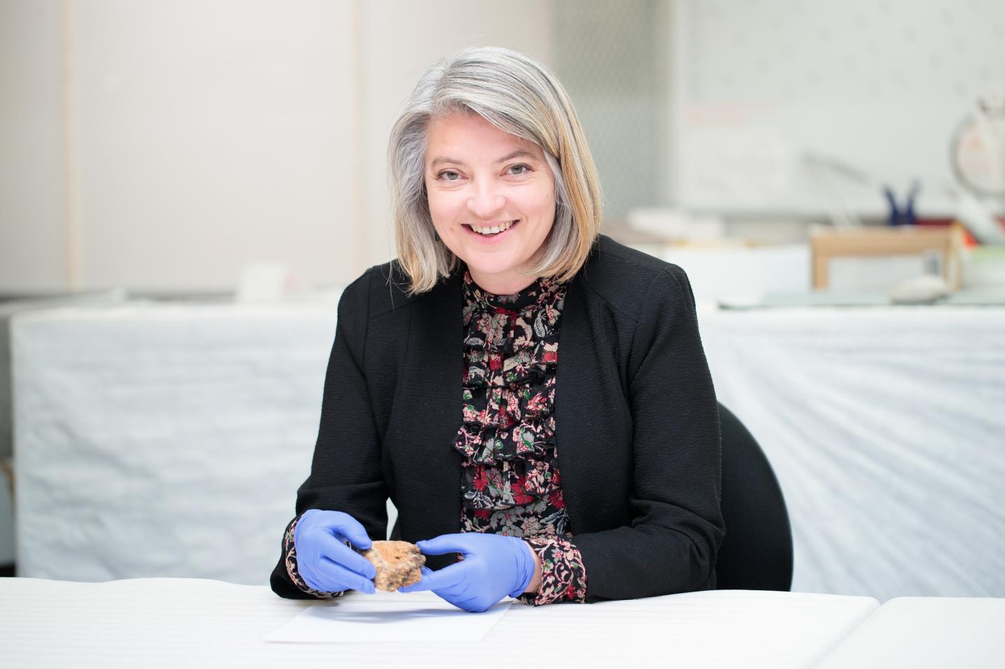 image: Dr Jill Haley, the study's lead author, holds a Spratt's dog cake fragment from Canterbury Museum's collection.