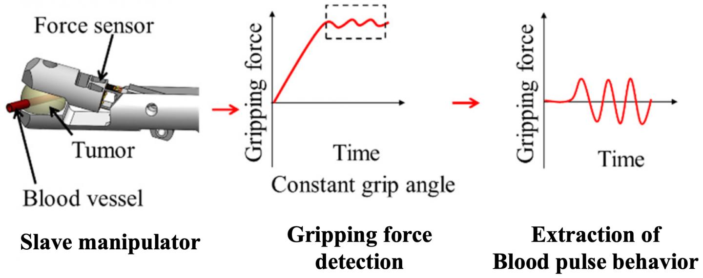 Thus, the scientists were successful in detecting pulsation of a simulated brain artery of 1 mm diameter in simulated soft and hard tumors. Although they present only basic results on the detection of the blood pulses inside simulated tumors during the gripping process, they believe that this new system will be useful for surgeons. If the surgeon suspects the existence of blood vessels inside a tumor, then gripping the tumor can be prolonged to determine blood pulses in the gripping force wave of the manipulator. Although the detection accuracy and speed of this method needs to be improved, it should be effective in avoiding hemorrhage during tumor resection, thus providing a route for tumor resection.