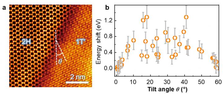 image: (a) The atomic structure of a 1T'/2H-MoTe2 phase boundary with a tilt angle of θ=23°. (b) The energy shift of plasmon EELS at phase boundaries with various tilt angles. For largely tilted phase boundaries (5°