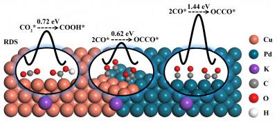 Recently, a research team led by Prof. Min Liu from Central South University, China designed a Cu-Pd bimetallic electrocatalyst possessing CuPd(100) interface which can lower the energy barrier of C2 product generation. The electrocatalyst was obtained through using an in-situ growth method based on thermal reduction to afford Pd nanoparticles as nucleated seeds. The results were published in Chinese Journal of Catalysis.
